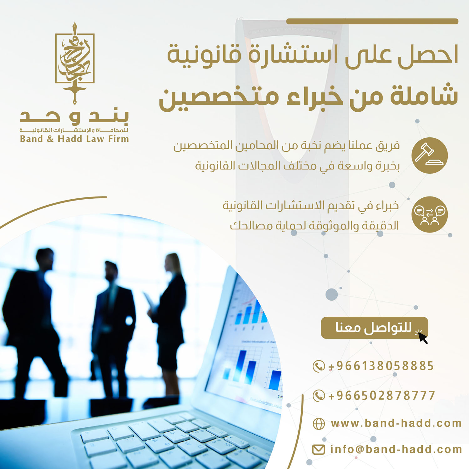 شركة بند وحد للمحاماة تقدم لعملائها في الرياض الاستشارات القانونية المتخصصة، مع فريق من المحامين ذوي الخبرة الواسعة في كافة المجالات القانونية. بصفتها واحدة من أفضل شركات المحاماة في الرياض، تلتزم شركة بند وحد بتقديم خدمات استشارية قانونية عالية الجودة، تساعد الشركات والأفراد على فهم تعقيدات القانون السعودي واتخاذ القرارات الصائبة. إن أفضل الاستشارات القانونية في الرياض متاحة لكم من خلال فريق عملنا المتمرس، الذي يسعى دومًا لتحقيق أفضل النتائج لعملائنا.